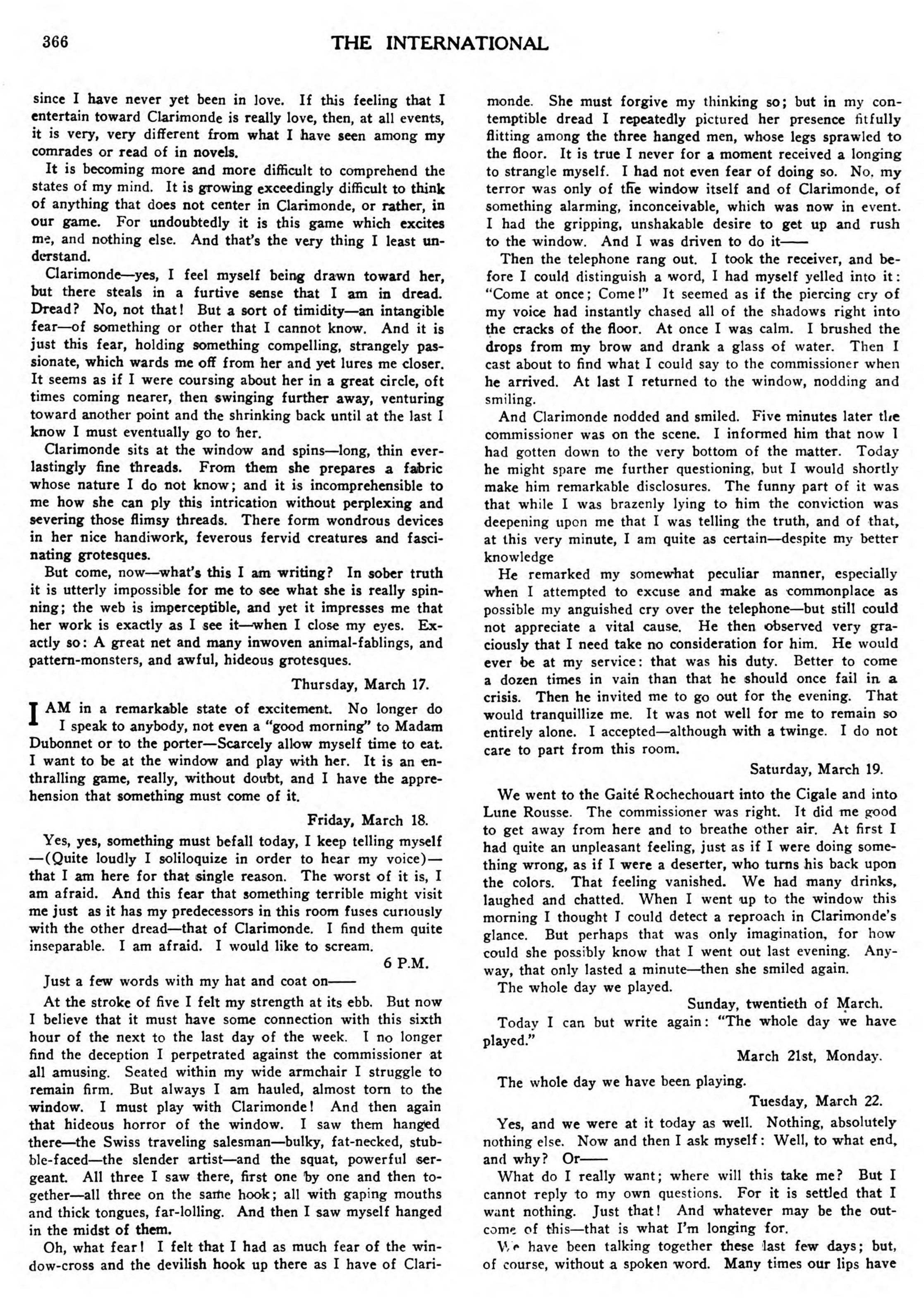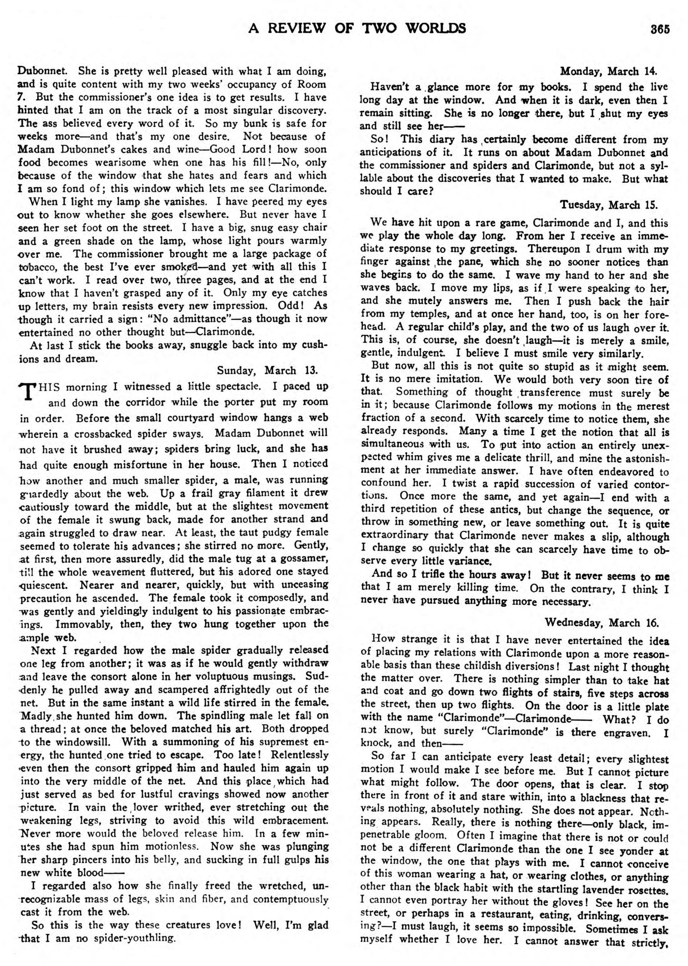 « Aucun de nous ne va aussi loin qu’on ne croit ; il y a place pour tous, vivants et morts… » Autour de moi, tout était presque intolérablement calme et décoloré, et pourtant une sorte de chaleur se dégageait au souvenir de ces paroles ; à la pensée aussi des millions de créatures vivantes confortablement endormies tout alentour ; chaleur encore à imaginer cette unanimité dans le sommeil. Les insectes et les fleurs, les oiseaux, les hommes et les bêtes, les feuilles même sur les arbres – tous partis au pays du sommeil. Dans l’attente du premier chant d’oiseau, on sentait, peut-être plus fortement encore qu’en plein jour, l’unité et la communion de toute vie, cette subtile fraternité entre les choses vivantes qui, toutes ensemble, tombent dans l’oubli pour se réveiller toutes ensemble.