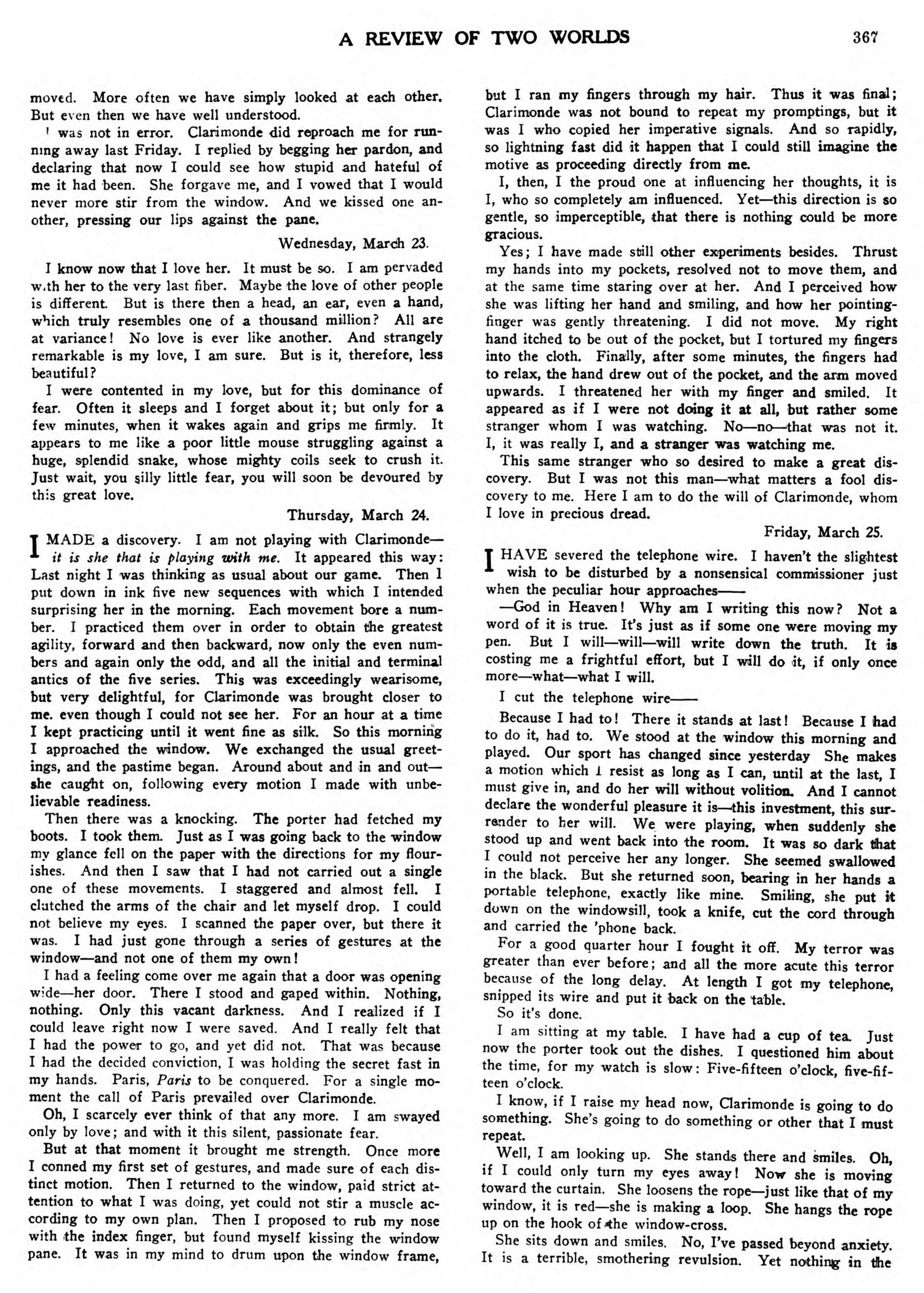 « Tout cela est bien un peu obscur. Mais observez-les, tous ces animaux réduits au silence, même les plus petits ; vous verrez qu’ils en savent infiniment plus que nous ne croyons ; et ils ont souvent des façons de faire aussi qui peuvent faire honte à l’homme. Il y a beaucoup plus de choses en eux que n’en montrent les apparences. » Et, sans remarquer ma surprise de ce plagiat inconscient, il ajouta : « Ah ! mieux vaut passer la nuit avec un cheval qu’avec un homme ! Ça a plus de bon sens et de patience. » Et, caressant le front de la jument, il reprit : « Allons, ma chère, c’est le moment de ta drogue. »